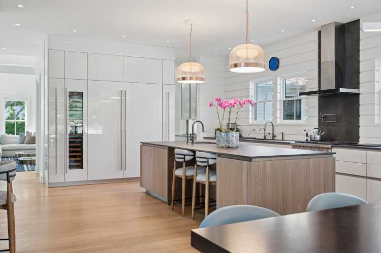 The spacious open kitchen has top-of-the-line appliances, such as Sub-Zero, Wolf and Miele, with a large 12-foot center island, counter seating, all designed for entertaining. A screened-in porch can be found off the kitchen, featuring automated screens that can retract at the push of a button to create a seamless indoor-outdoor experience.