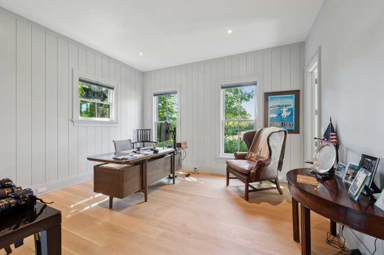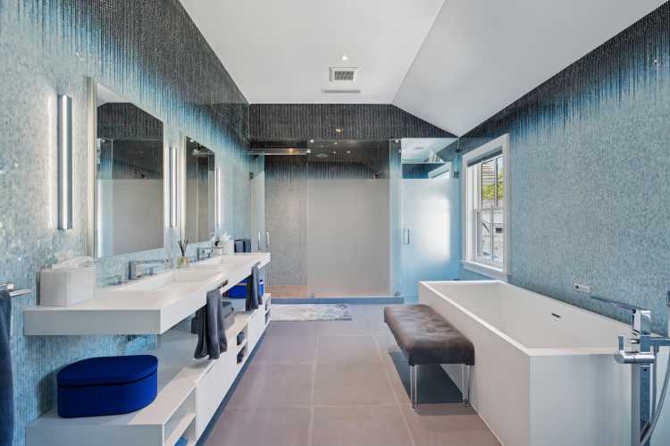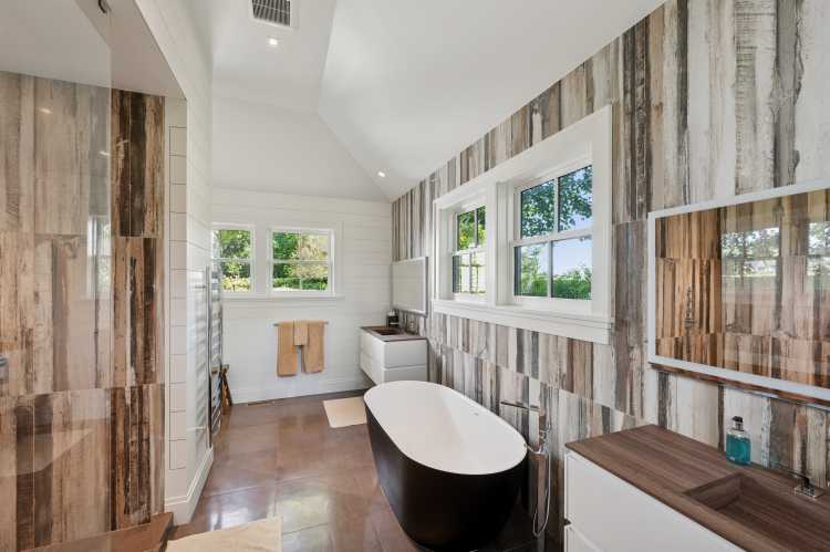 Back inside, on the other side of the house, there is a primary suite, perfect for guests or the homeowner, with sliding glass doors that lead out to a covered patio. The spa-like bathroom includes an oversized shower and natural stone flooring, a freestanding tub and walk-in closets. There is also an office nearby with its own bathroom.
