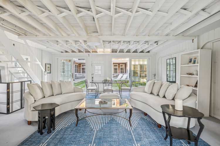 A patio connects the main home to the classic barn, where there are several large sliding glass doorson into this transformed space. Exposed beams, whitewashed floors and lattice work give it a coastal vibe. It features an open living space with a fireplace and a second-floor loft. An attached covered porch overlooks the freeform pool. There is also a nearby cabana for additional relaxation.