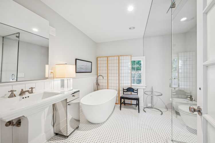 The foyer of the home offers immediate access to the library on one side and a dining room on the other, as well as a staircase to the second level. In the library, there is the first of three fireplaces in the home. A doorway separates the library from an oversized living room, which also features a fireplace and exposed beams and overlooks the backyard. A door leads to the newly completed primary suite that enjoys French doors to the gardens, as well as a walk-in closet and a bathroom with a glass-enclosed shower and a standalone tub.