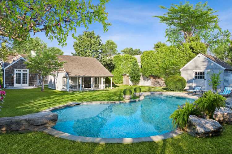 The Cape Cod-style, 3,000-square-foot residence, located in its current position since teh 1950s, sits on just under a half-acre along with a pool and a barn, all surrounded by lush gardens.