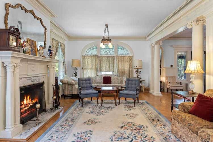 Two stone pillars greet guests at the sidewalk with a stone path that leads up to the 950-square-foot wraparound porch. Inside the home, there is approximately 4,500 square feet of living space, plus a full basement and walk-up attic that nearly doubles the home’s footprint.