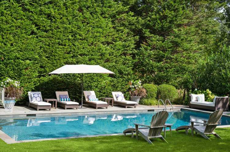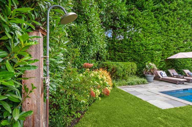 The 3,200-square-foot home sits on a half-acre with a heated gunite pool, an outdoor shower and an attached two-car garage, surrounded by lush landscaping and a wide lawn.