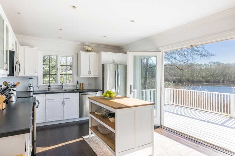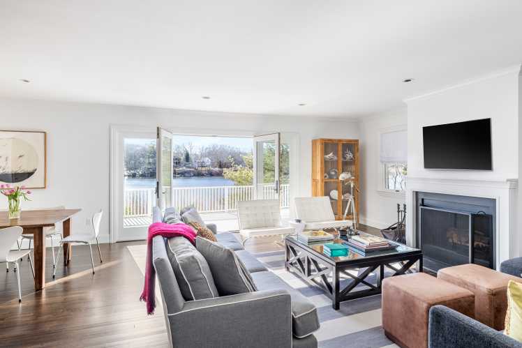 The shingled home at 141 Big Fresh Pond Road offers easy waterfront living with sunset views across the pond. The renovated three-bedroom, three-bath home sits on a 0.28-acre lot.