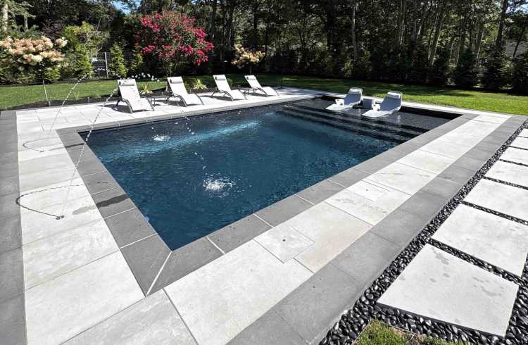 Many are gunite, but he noticed some are gravitating toward vinyl interiors thanks to platinum onyx, one of the newer liners that his distributor LOOP-LOC, a luxury pool liner company, provides, which offers “a beautiful shimmer.” A recent cocktail pool in East Quogue, completed this spring, utilized it.