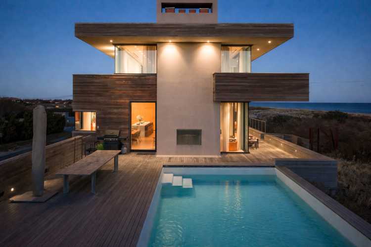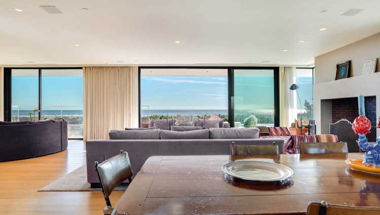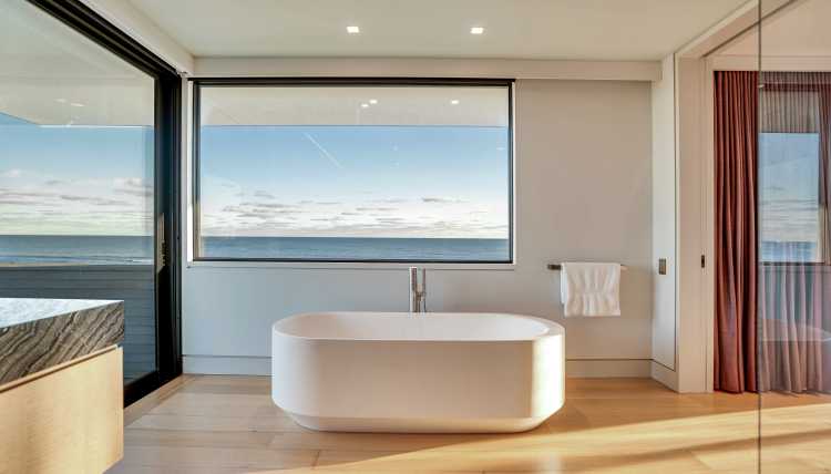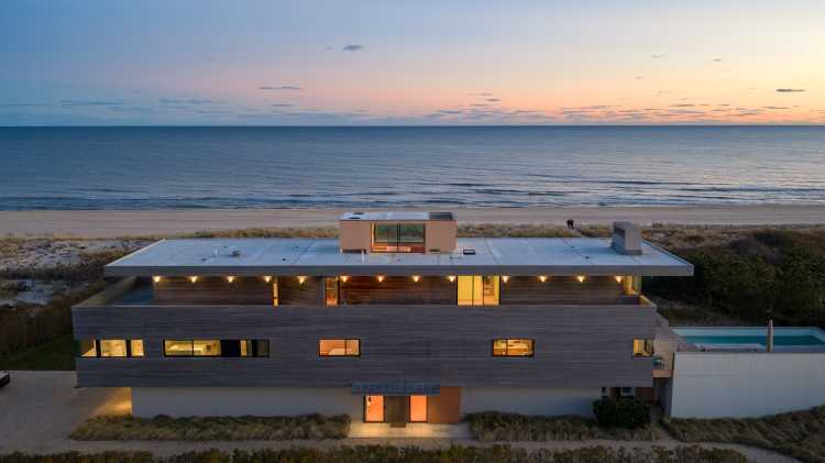 Built in 2018, the three-level house was designed by Mark C. Matthews Architecture in collaboration with Francis D’Haene of D’Apostrophe Design. Among the many standout features is a three-story glass elevator that maintains those ocean views at every level.