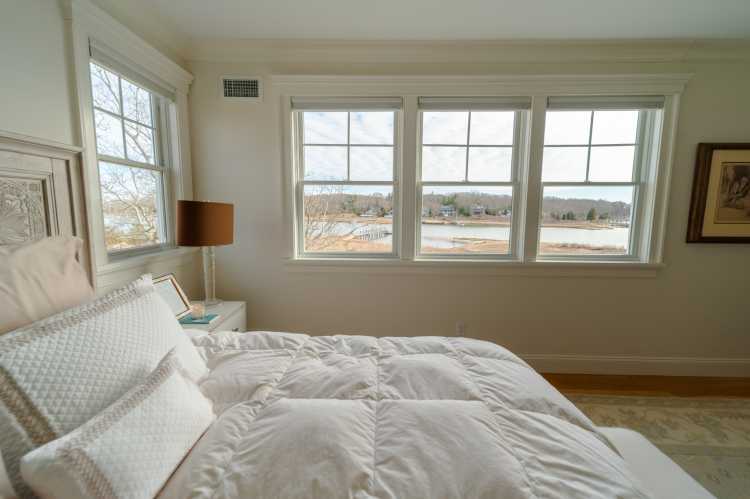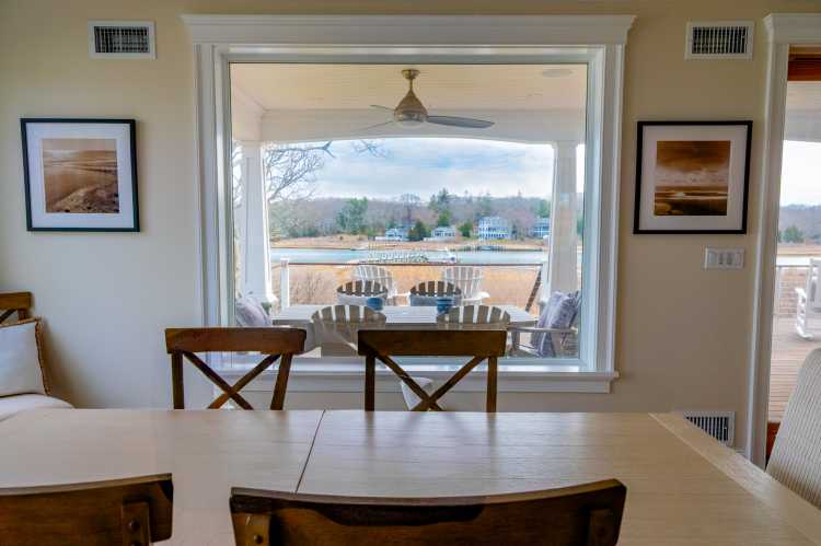 The dining area is just beyond the kitchen, while a stone fireplace anchors the living room. Both the dining and living areas boasts picture windows that frame the water.