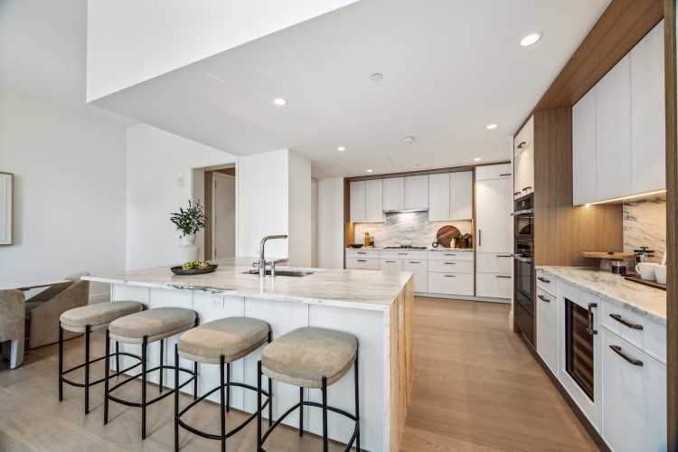 The kitchen features white painted cabinetry with blonde oak accents, Mountain White marble slab countertops and backsplash, and is equipped with premium Sub-Zero and Miele appliances and Dornbracht fixtures.Jon Nissenbaum for Brown Harris Stevens