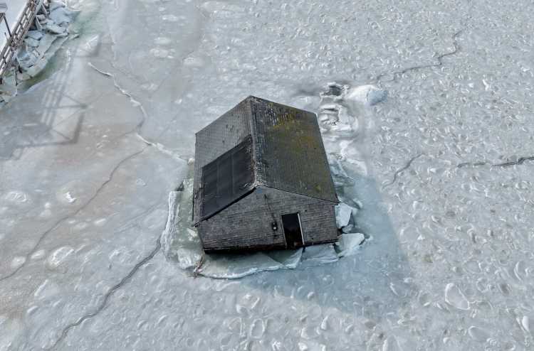 That came to an end on Saturday night when the stilts collapsed and the shingled structure hit the icy top layer of the harbor, becoming partially submerged. Drone photography from Tim Tierney’s SkyHamptonAerial shows large cracks splintering the ice as the house sank.