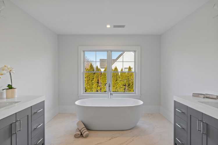 The primary suite can be found on the second level. This private retreat offers “a spa-inspired bath” with radiant heated floors, a large shower, a soaking tub and dual sinks. The bedroom includes a sitting room, two walk-in closets and, perhaps best of all, a private terrace with stunning water views across Mattituck Inlet.