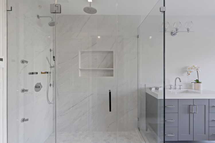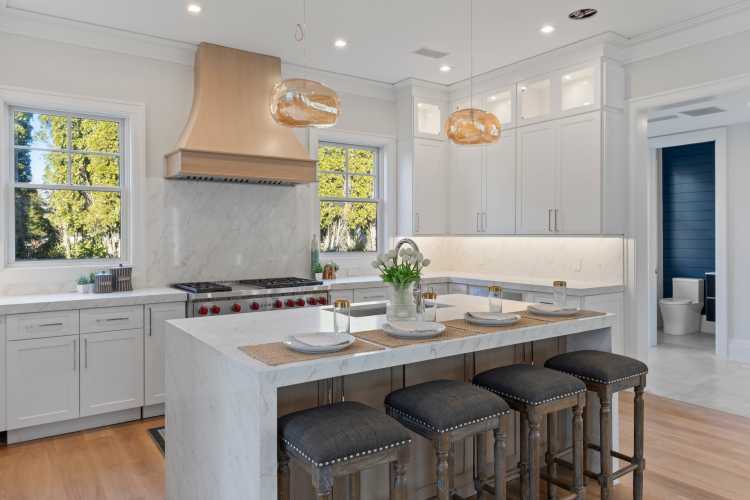 There is 5,920 square feet of space, starting with a large, double-height foyer that leads to the airy, open-concept layout, including a living room, kitchen, dining area and family room, all under high ceilings. The great room boasts walls of glass for the perfect view of the water, and Andersen 400 Series double-hung windows that allow plenty of natural light into the space. There is also a Heat & Glo 36-inch propane fireplace with tranquil surround, LED lighting, fan blower, and multi-function remote for ambiance and keeping warm in cooler weather.