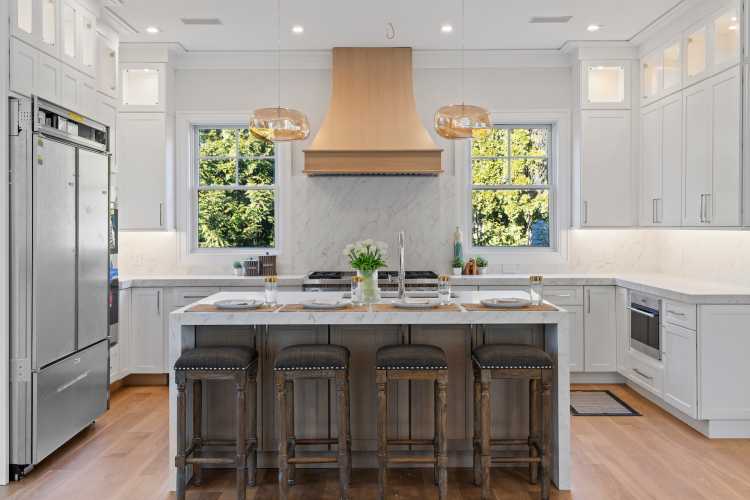 The chef’s kitchen is equipped with custom cabinetry extending to the the ceiling, quartz countertops and top-notch appliances, including a 48-inch Sub-Zero refrigerator, 48-inch Wolf gas range, 30-inch Wolf double wall oven, 24-inch Wolf microwave, and 24-inch Miele dishwasher.