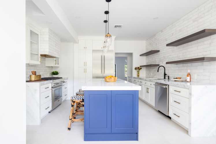 The chef’s kitchen features top-of-the-line Thermador appliances, a stylish backsplash, a center island and 2.5-inch quartzite countertops. The kitchen flows into the connected dining area.