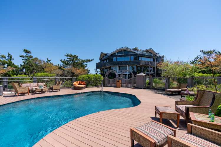 A deck wraps around the top level, with several different areas for dining, relaxing or gathering to look out onto the ocean.