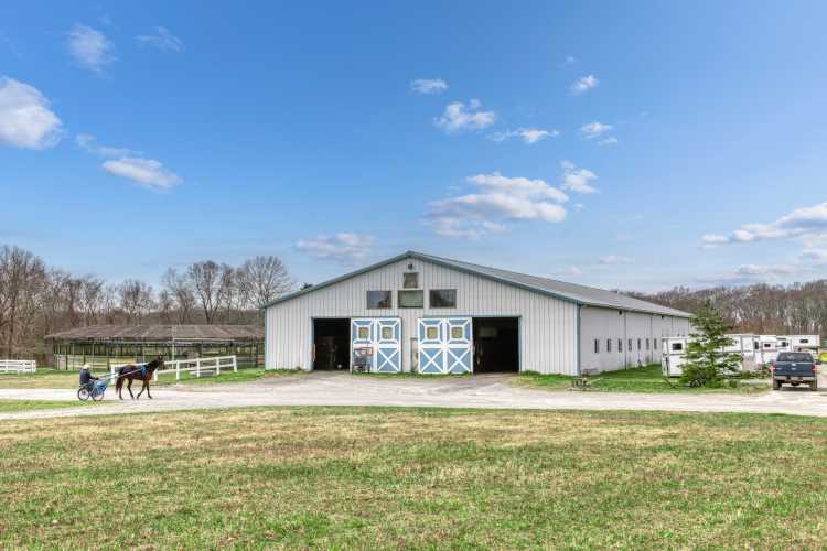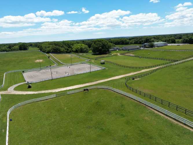 The largest parcel, now Thunder Road Stables, includes a four-bedroom, two-bathroom home, as well as the equestrian facilities. There are nearly 90 stalls, multiple outdoor riding arenas, an indoor arena currently under lease and a half-mile training track, along with expansive pastureland stretching across the Main Road corridor, with a mix of open pasture and wooded sections.