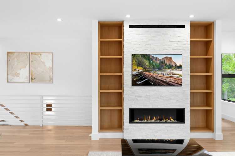 The first level holds four en-suite bedrooms, while the upper level presents the primary suite and a massive open great room with a living space centered around a stone gas fireplace and custom built-ins. The open chef’s kitchen boasts induction cooking and Plain and Fancy cabinetry.