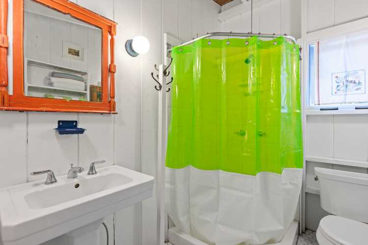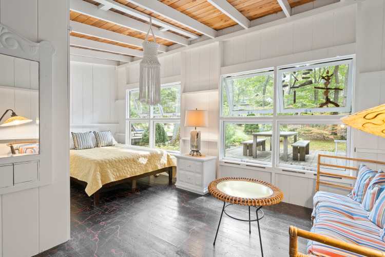Sitting on just over a half-acre, the 1,400-square-foot house offers two bedrooms and one bathroom. Expanded in the 1970s and thoughtfully renovated in recent years, the newest wing of the house offers a spacious great room with a wood-burning fireplace, exposed beams and built-in bookshelves. There is an adjacent dining area with sliding glass doors that lead to the deck, perfect for entertaining and al fresco dining.