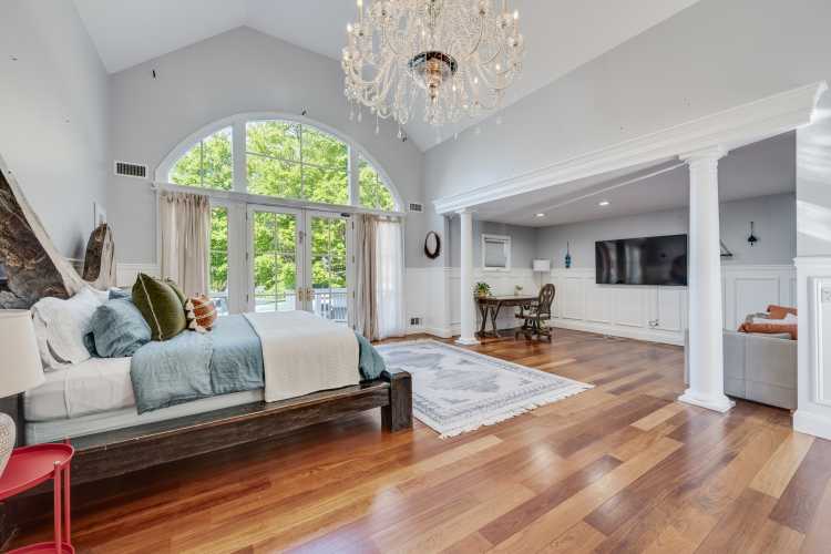 The primary suite offers tall ceilings, a private sitting room and French doors that lead out onto a patio. There is also a walk-in closet.