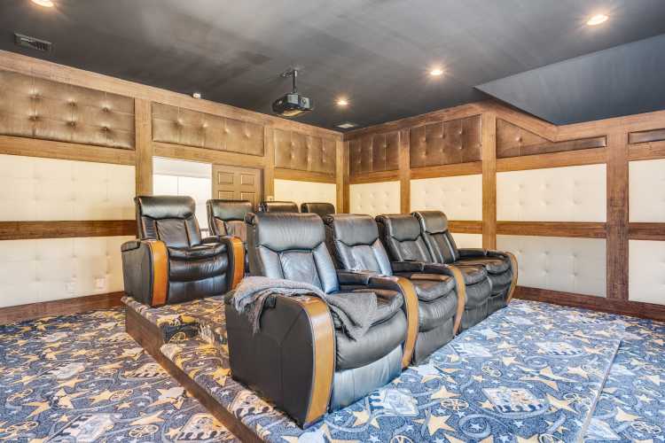 Thanks to a complete renovation in 2020, it features a gourmet kitchen and a movie theater, which is down in the lower level along with the home gym.