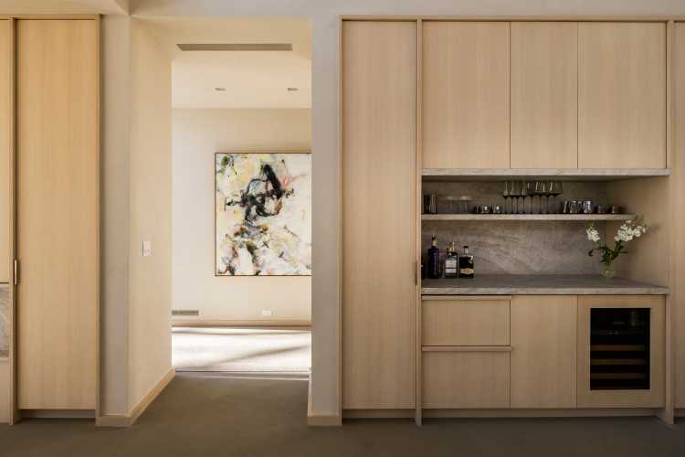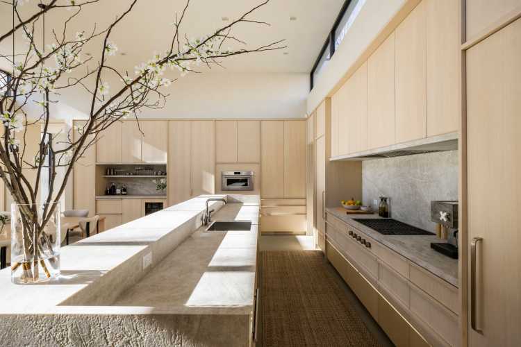 The 4,000-square-foot house features oversized open-concept living areas and floor-to-ceiling window walls in the living room frame water views and natural vistas. A paneled wall to match the hidden cabinetry in the kitchen surrounds the elongated gas fireplace.
