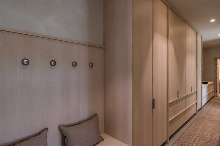 The state-of-the-art chef’s kitchen features Wolfe, Sub-Zero and Miele appliances and Victoria Falls quartzite countertops and a long center island, and benefits from light shining through windows above the tall cabinetry and paneled wall. All millwork and cabinetry has individually created with stain grade.
