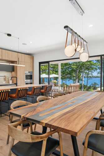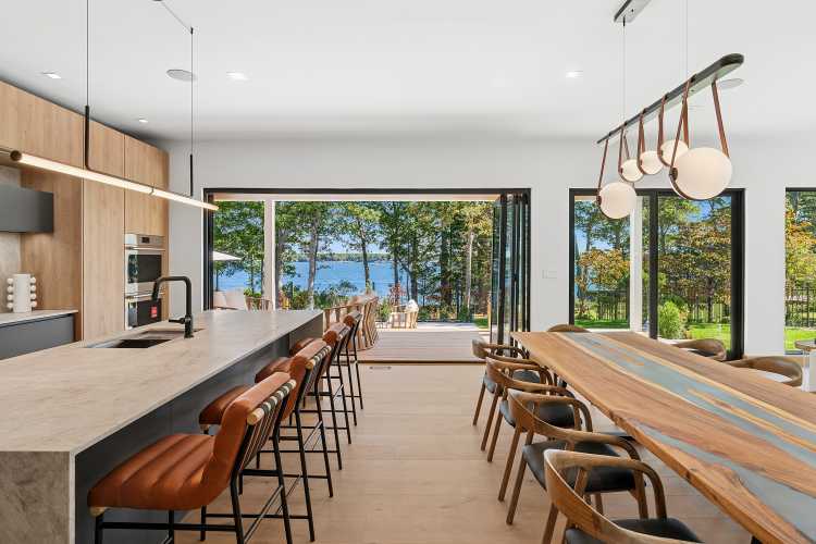 A dramatic double-height foyer gives way to an open-concept, sun-filled living and dining spaces thanks to walls of glass that frame the sweeping water views. A sleek imported German kitchen offers extensive integrated storage and custom inserts, complemented by modern finishes. There is also a large center island, high-end appliances, such as a double oven, and two large wine fridges. A dining area sits between the kitchen and living space.