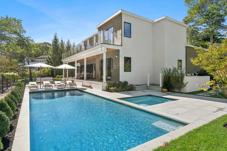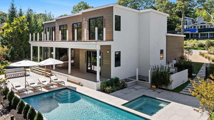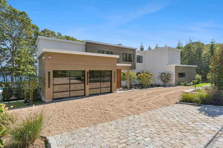With nearly 7,500 square feet of space, the modern residence sits on almost one acre with approximately 140 feet of frontage on Three Mile Harbor.